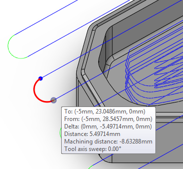 - Move the mouse over any other points on the toolpath. A tooltip shows the coordinates, delta distance (X,Y,Z), distance in space, and machining distance.