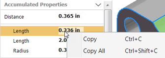 Make as many selections as needed in the graphics window and click the plus sign next to the measurement type in the Measure panel to add values to an accumulated group. The values display in the accumulation group specific to the measurement type. For example, a radius is added to the Distance group, and an angle is added to the Angle group under Accumulated Properties.