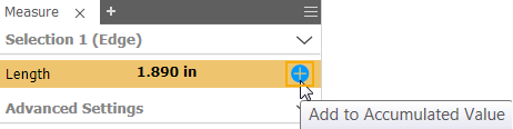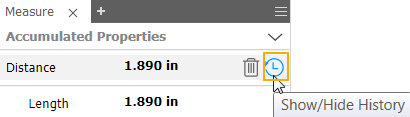 To add a linear, area, volume, and/or angle measurement to the Accumulated Properties section: Make a selection in the graphics window, and then click the plus sign next to the measurement type. For example, select a line in the graphics window, and then click the plus sign next to the measurement. The value is added to the Distance measurement group under Accumulated Properties. Click Show/Hide History next to Distance to display the value you just added.