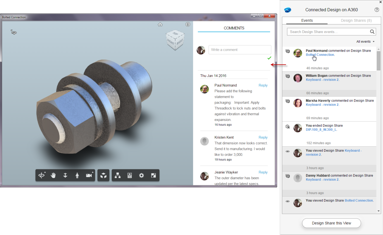 Owners and collaborators who have Inventor 2017 can now open a Design Share, view, and post comments in the viewing window inside of Inventor.