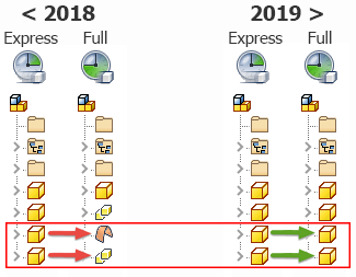 For 2018 and prior releases, in Express mode, solid, surface, and multi-body components were displayed using the standard part icon. When you switched to Full mode, the icons changed to display as a solid, surface, or multi-body component.