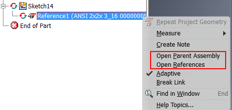 In a part file, right-click the Reference node in the browser and select Open Parent Assembly from the context menu to examine cross-part references in the assembly file the reference was created in. Select Open References to open the part the reference was created from.
