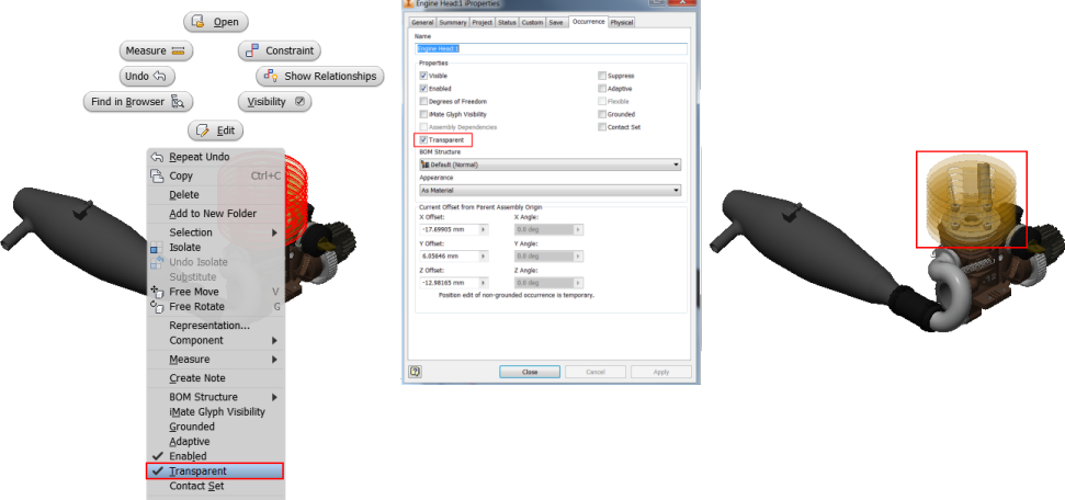 You can now toggle the transparency of a component in an assembly without applying an Appearance override.