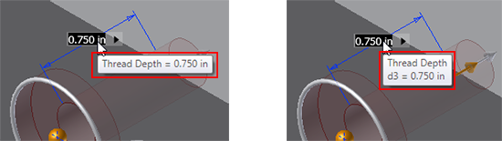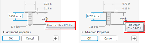 For the Hole command, when a value is invalid, for example, the specified thread length is larger than hole depth, the value color turns red and the tooltip reports the value is invalid when you're entering the value. This allows you to immediately correct the value or locate another value that needs editing for this one to become valid. When a value is valid, the value color is black.