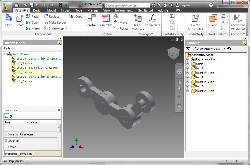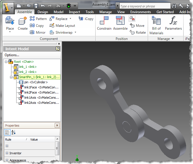 Since there’s a known, logical way to constrain the pin to the two links, it would be best if these were created automatically. We can create a “smart" pin design by collecting the pin and the necessary constraints in a component group. Start by creating a new design that mixes in IvComponentGroup: