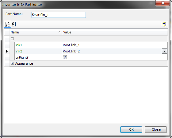 Now add a SmartPin child, selecting link_1 and link_2 in the Part Editor