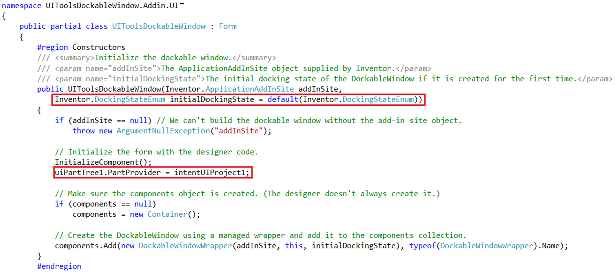 - Open the code for the InventorDockableWindowDesign, and locate the constructors for your DockableWindow class.