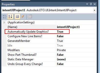 By default, the IntentUIProject does not cause graphics to update automatically when a change to the Intent model takes place. This behavior is to allow you to make a series of changes without waiting for time consuming graphics updates between each one. However, our sample project is simple enough that enabling automatic updates does not pose a significant performance cost. Go to the IntentUIProject that we added to our form and in the Properties, switch Automatically Update Graphics? to True.