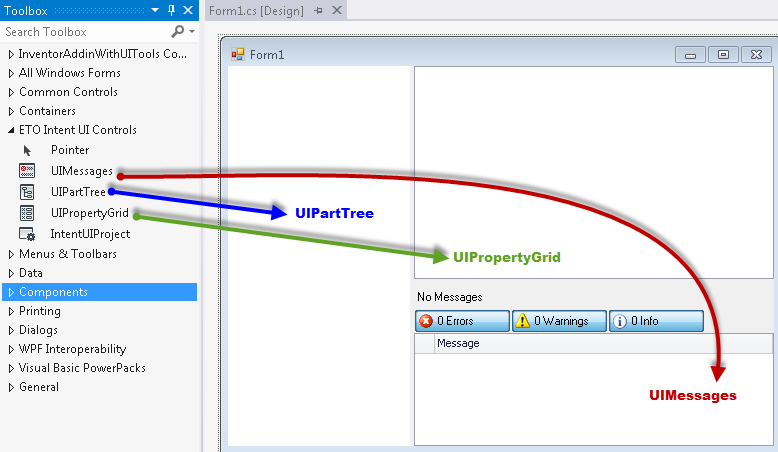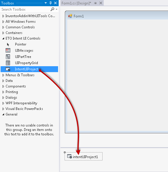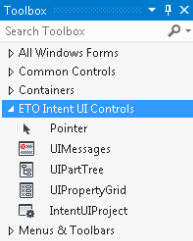 Once these DLL references are added, add the various UI Tools controls from the Visual Studio Toolbox. These controls are in the Toolbox on a tab named ETO Intent UI Controls.