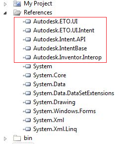 Before you can add any of the UI Tools controls to our add-in form, first add references to the UI Tools assemblies to the Visual Studio project. There are two DLL references that are required to use the UI Tools: Autodesk.ETO.UI.dll, and Autodesk.ETO.UI.Intent.dll. Also required are references to the core Intent Autodesk.Intent.API.dll and Autodesk.IntentBase.dll assemblies. Finally, because this UI runs as an Inventor add-in, we need a reference to Autodesk.Inventor.Interop.dll.