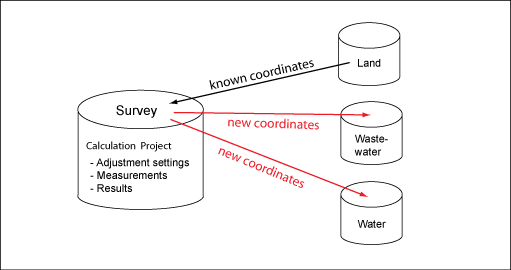 The Survey module stores measurements, calculation settings, and results in a separate database schema. Control points that are needed for the adjustment calculation can be stored in any industry model on the server. Also, you can distribute the new coordinates to any industry model on the server.