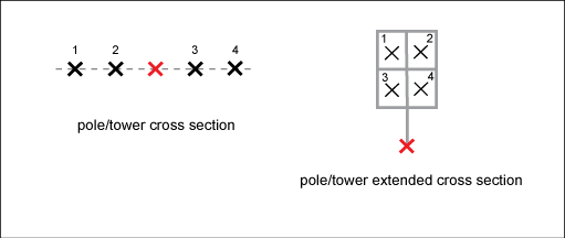 Tower with two conductors. The standard cross section displays two snap points for two more conductors. Use the standard cross section for data acquisition, and the extended cross section is for visualization only.