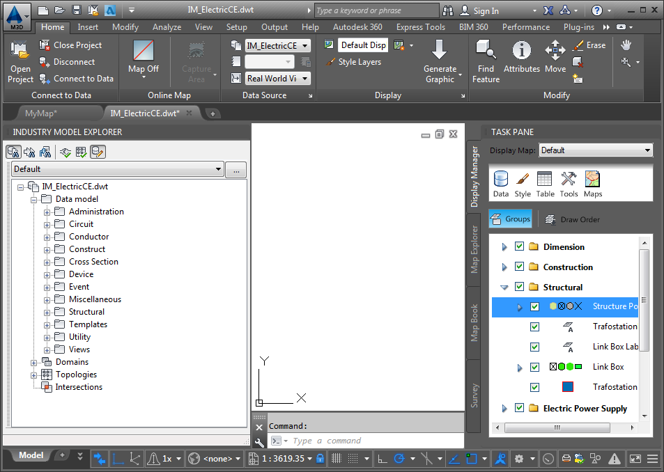An industry model drawing contains an industry data model. Use industry models to ensure that features you create follow rules and standards, similar to classified drawing data . Industry model drawings have access to advanced functionality, such as feature class forms, reports, and analysis tools. For more information, see About Industry Models.