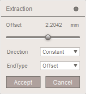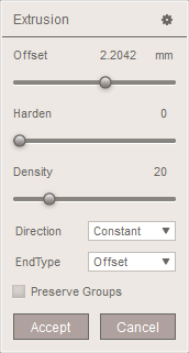 The Extrusion property panel is shown below. The Offset parameter determines how far the extrusion is pushed away from the input surface.