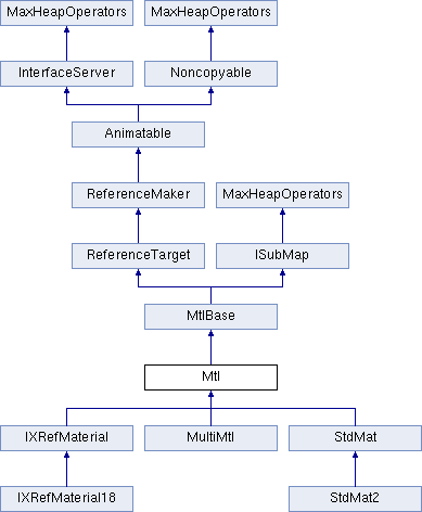 This is the base class for the creation of material plug-ins. This class provides methods to do things such as compute the properties of the material for a given location, return the number of sub-materials and access the properties of the material for the interactive renderer.