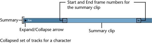 The summary clip represents all the clips under your character, group, subcharacter, or object. You can drag the summary clip to move all the clips in all the tracks under a character, group, subcharacter, or object. You can also scale a summary clip by Shift-dragging its beginning and end or by editing its Start and End frame numbers.