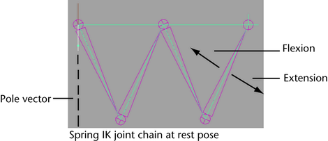 The spring IK solver keeps the angles between joints in its joint chain proportional by applying bias values to those angles. This ensures that the angles between all joints are always evenly distributed. The spring IK solver is similar to the rotate plane IK solver in that both their IK handles have pole vectors. Since the spring IK handle has a pole vector, flipping will occur if the spring IK joint chain crosses its pole vector.