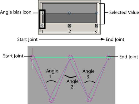 Specifies the bias value for the selected angle bias icon. The angle bias is a relative weight that determines how fast a joint rotates in relation to the other joints in the same chain. The angle bias functions as a multiplier, influencing the angles between the bones in the target joint chain.