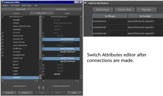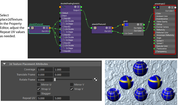 - A place2dTexture node is created when you map a 2D texture. Select the texture’s place2dTexture swatch in