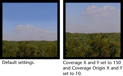 The number of horizontal and vertical pixels of the image file displayed on the image plane. The default values for Coverage X and Coverage Y are the horizontal and vertical resolution of the image file. By decreasing these values, you can limit the portion of the image file that is displayed.