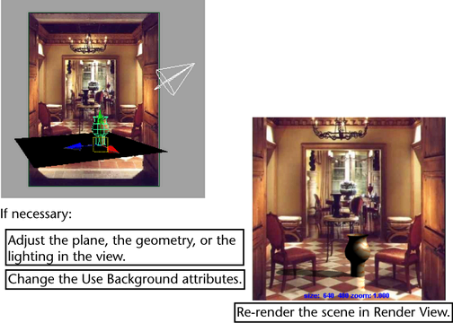 - Adjust the location of the geometry, the lights, and the Use Background attributes if necessary and then re-render the scene at any time.