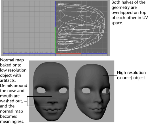 If both halves of the geometry are rendered into the normal map on top of each other, the mirroring of the normals introduces artifacts into the combined result. Therefore, you need to specify which half of the geometry defines the normal map (and which half just uses it).