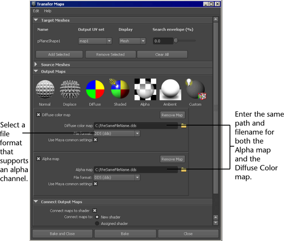 - Scroll to the Connect Output Maps section to specify how the texture map you are going to create will be linked to the target mesh. To view the results of the texture map within Maya, enable Connect maps to: New shader /Connect maps to: Assigned shader.