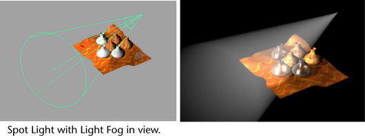 Try this simple example. By mapping a Volume Shader to a Spot Light’s Light Fog, you can map textures to the Volume Shader’s attributes and change the fog’s visual effects.