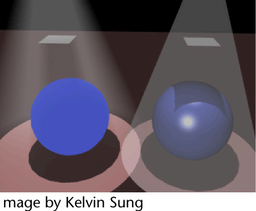 In the next example, the sphere on the left appears flat (2D) because it is shaded by a Surface Shader. Notice the absence of shadow on this sphere compared to the one on the right. The light fog on the right appears flat because it is shaded by a Volume Shader. Notice the absence of volume shadows compared to the light fog on the left.