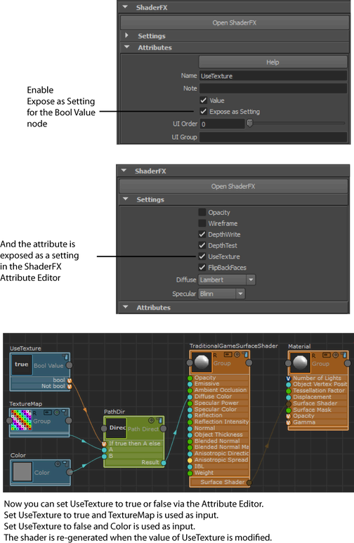 In this example, a Bool Value node is created and renamed to UseTexture to better reflect its purpose. Its Expose as Setting attribute is enabled so that, when the ShaderFX editor is closed, you can set its value to true or false in the Settings section of the Attribute Editor. When UseTexture is set to true, TextureMap provides the diffuse color. When set to false, Color provides the diffuse color.