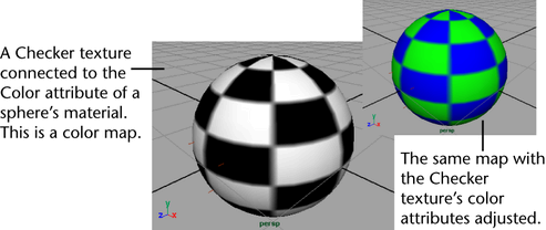 For example, if you connect Maya’s 2D black and white Checker texture to the color attribute of an object’s material, you have applied a color map; the checkered pattern determines which parts of the object appear black and which appear white (or other colors if you adjust the texture’s color attributes).