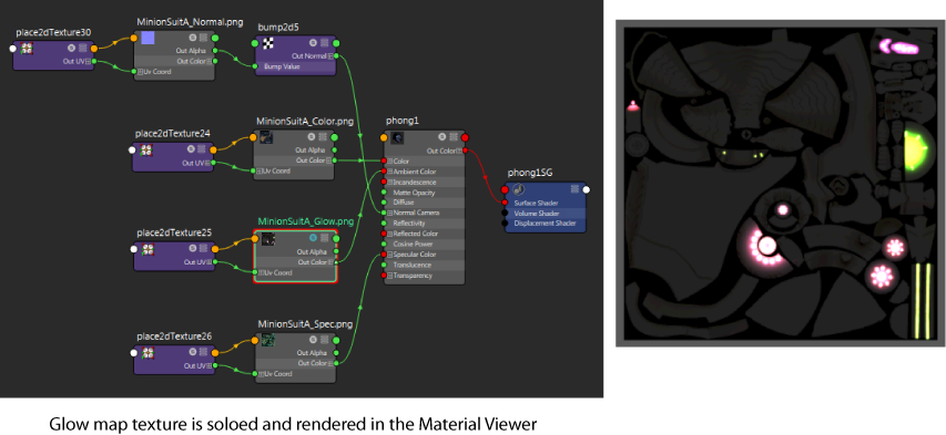 In this example, you can select any node in the graph to see the downstream result of the network (phong1) in the Material Viewer. The node that is rendered in the Material Viewer is denoted by a red border.