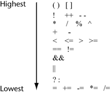 The following shows the order of operator precedence in MEL. Operators on the same row have equal precedence. If a statement has two or more operators with the same precedence, the left-most operator is evaluated first. Unary and assignment operators are right associative; all others are left associative.