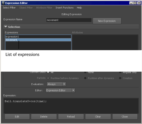 An Expressions list appears in the Expression Editor. This list shows all expressions created for the scene.