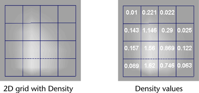 The following example of a 2D fluid shows Density in a grid. The image on the left shows the image in shaded display mode. The image on the right shows what the actual Density values are in each voxel.