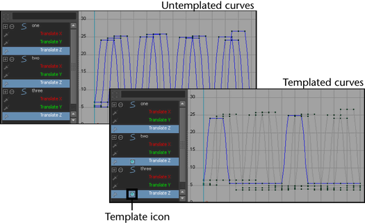 When an animation channel is templated, its keys continue to contribute to its object’s overall animation, but its curve and keys in the graph view are no longer selectable. Also, a small icon appears beside the templated channel in the outliner, and the templated channel curve appears gray in the graph view.