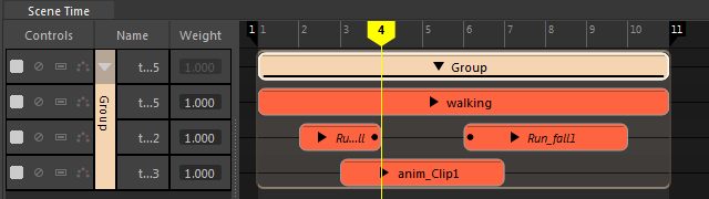 Group clips let you package multiple clips together for better organization. For example, you could package a karate move comprised of a kick, punch, and turn, and then reuse this Grouped motion on another character. You can import FBX files with multiple takes into one Group clip. See Multiple Takes in the Time Editor.