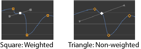 Weighted tangents have long tangent handles that control the angle and weight of the tangent. Weighted tangents provide finer control over your animation curves.