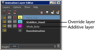 When an animation layer is in Override mode, its name displays in bold in the Animation Layer Editor.