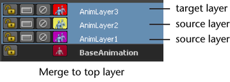 - Merges the selected layers to the selected layer that is lowest in the stack. (The lowest layer is the ‘target’ layer, all other selected layers are ‘source’ layers.)