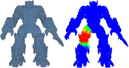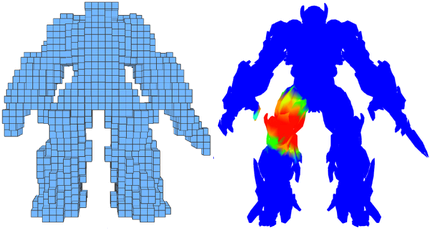 The following images show a mesh voxelized at two different resolutions. In the first image, since a coarse resolution is selected, knee and hand voxels become connected. This results in deformation of knee geometry when the arm moves, and so on.
