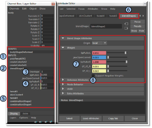 See the table below this image for information on the nodes and attributes associated with blend shape deformers.