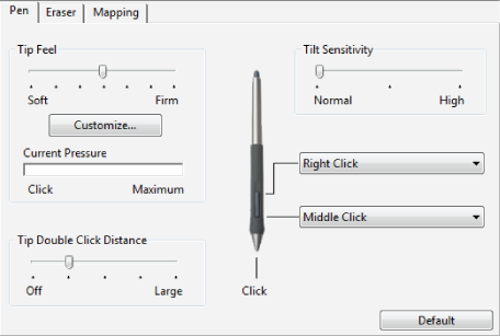 If you find that hovering the pen above the surface of the tablet is awkward for middle and right-click camera actions, you can configure the Wacom pen tablet using the following method. With this option you must first press down the side switch and then click with the pen tip on the tablet surface to perform any click function (Right Click, Middle Click) assigned to the side switch.