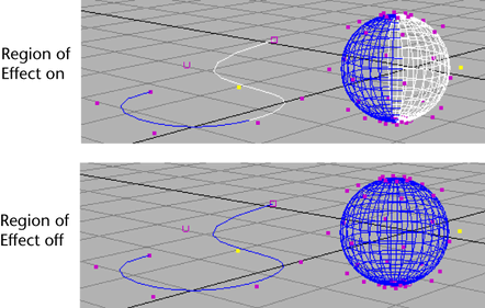 This option lets you turn on or off the region of effect display. Region of effect is the part of an object that potentially changes as a result of moving selected CVs. Note that curves show the region of effect as well as surfaces. The default is on.