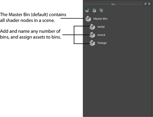 A default Master bin contains all shading nodes in your scene. You can add any number of additional bins to a scene and assign nodes to one or more of those bins. By strategically naming the bins, (for example, wood, metal, doors, foliage), you can quickly and more easily locate shading assets to work with them.