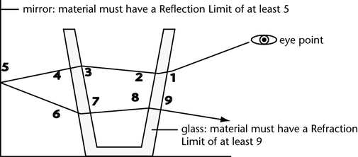 To simulate realistic looking glass, set the Refraction Limit value to 9 or 10.