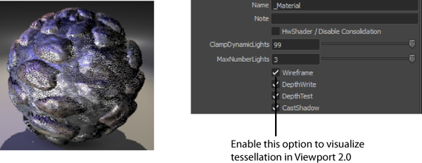 To visualize tessellation and displacement in Viewport 2.0, you must be working in the DirectX 11 environment and have the dx11Shader.mll plug-in enabled. For more information, see Using DirectX 11 with Viewport 2.0.