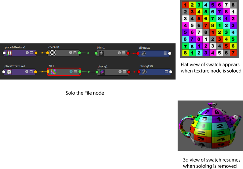 If you solo a node that is not part of the active shading network, the Material Viewer updates to reflect the soloed node in flat view and the viewport updates to reflect the soloing results. In other words, soloing takes precedence over selection.