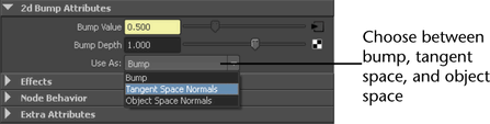 To select the bump node for the shader network currently assigned to your object, select the object, then select Graph > Graph Materials on Selected Objects from the Hypershade menu. Select the bump2d node in the resulting graph in the Hypershade work area panel.
