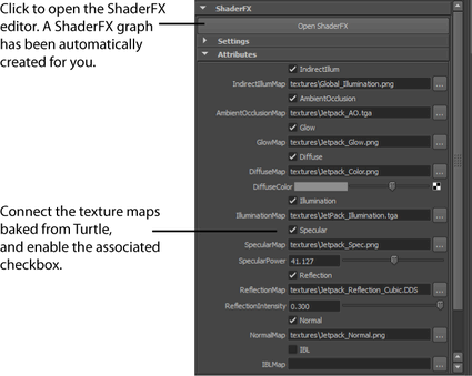 After baking your textures using Turtle, you can visualize the textures in ShaderFX. A ShaderFX graph network is provided with Maya and you can easily connect your textures using the Maya Attribute Editor.
